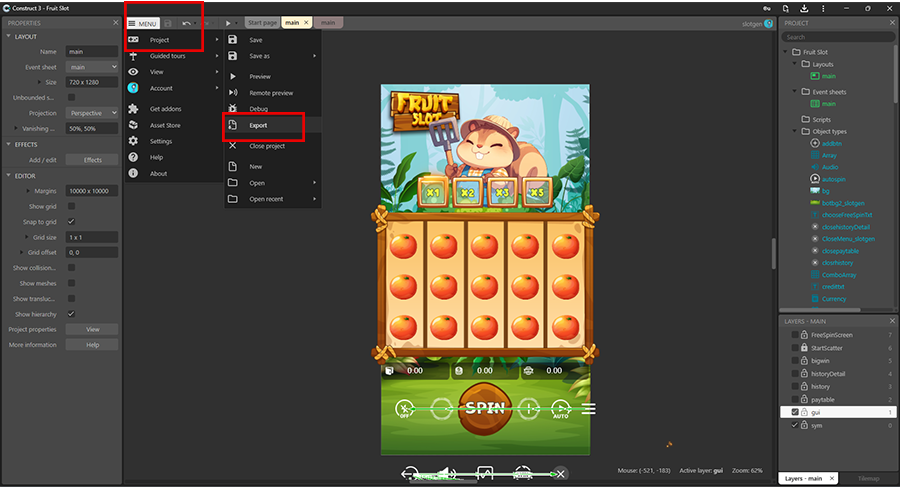 Step 1: From the Construct 3 window, click on the "Menu" button then select "Export" or press F6. Then select "Web".