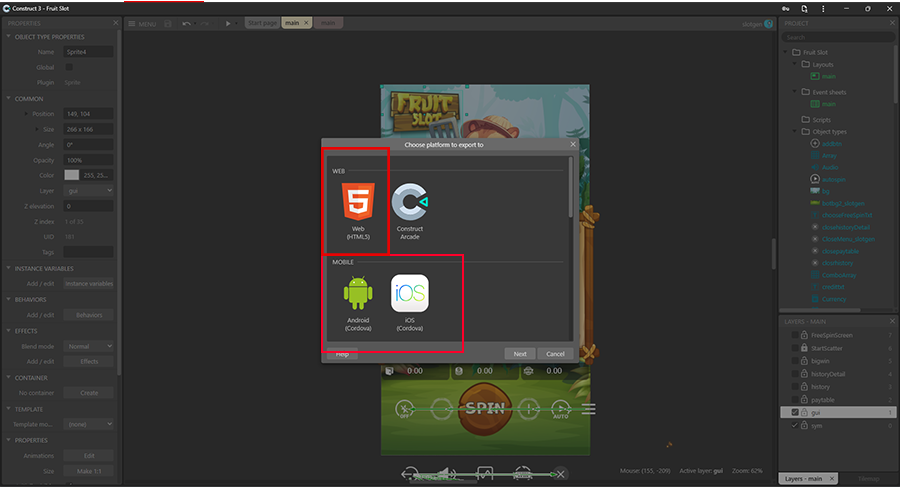 Choose Android(Cordova), iOS(Cordova) or Web(HTML5) according to which platform you want to export to.