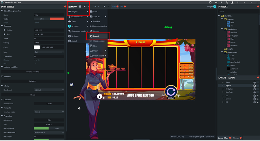 Step 1: From the Construct 3 window, click on the "Menu" button then select "Export" or press F6. Then select "Web".
