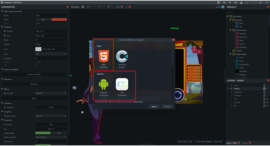 Choose Android(Cordova), iOS(Cordova) or Web(HTML5) according to which platform you want to export to.