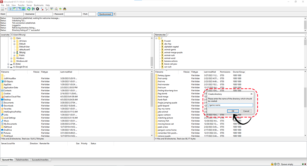 Step 3: Open the FileZilla window and log in. You need to have the following information: Host, Username , Password, Port section you type 21. Then right click and select Create Directory